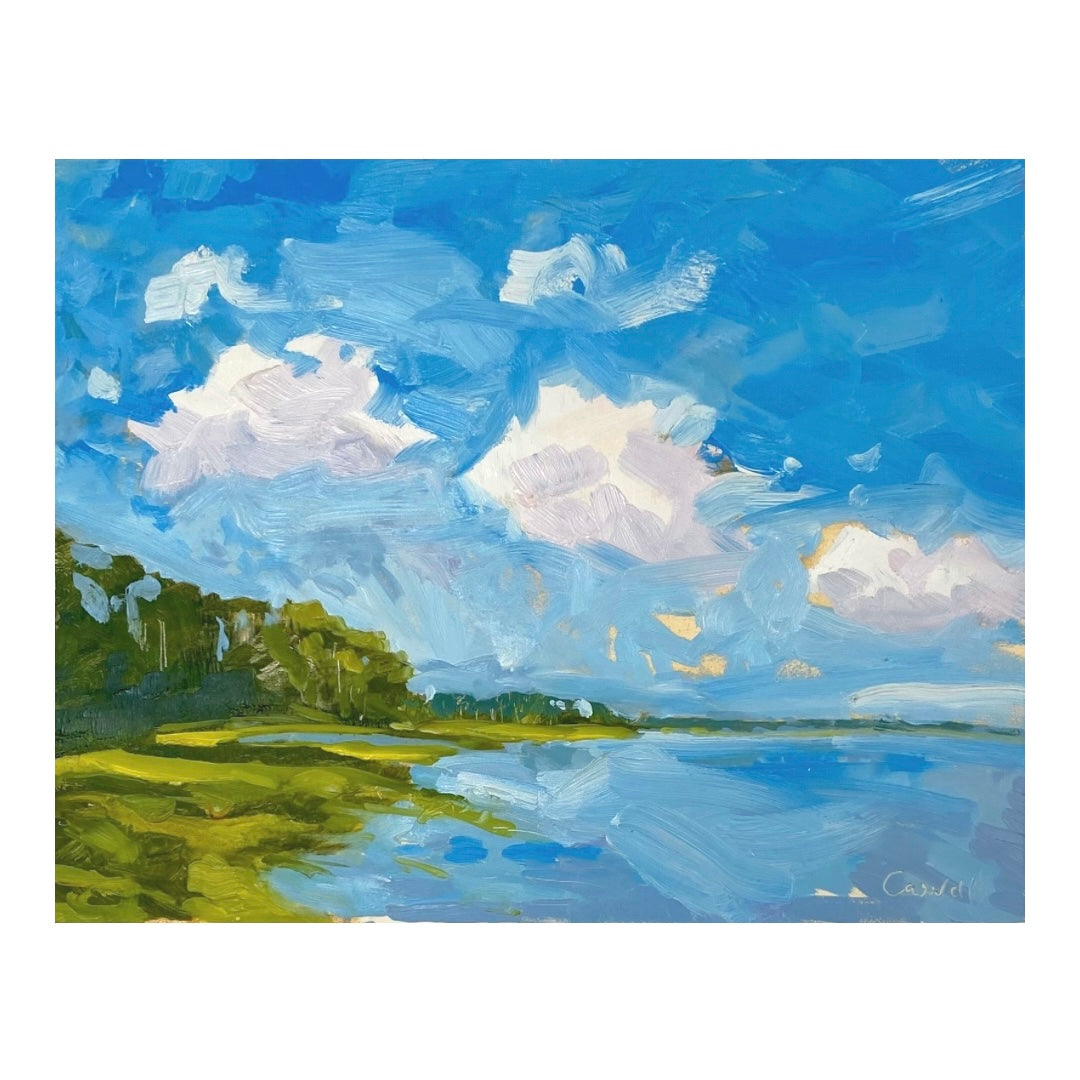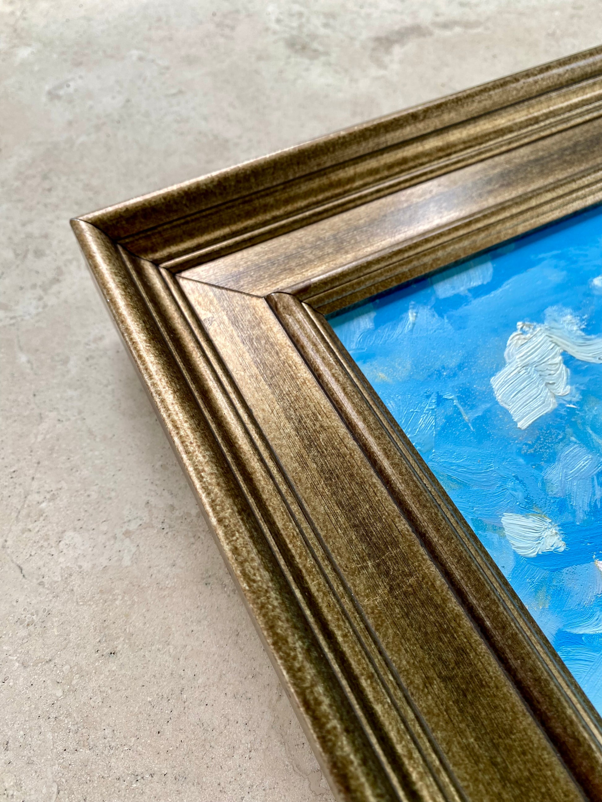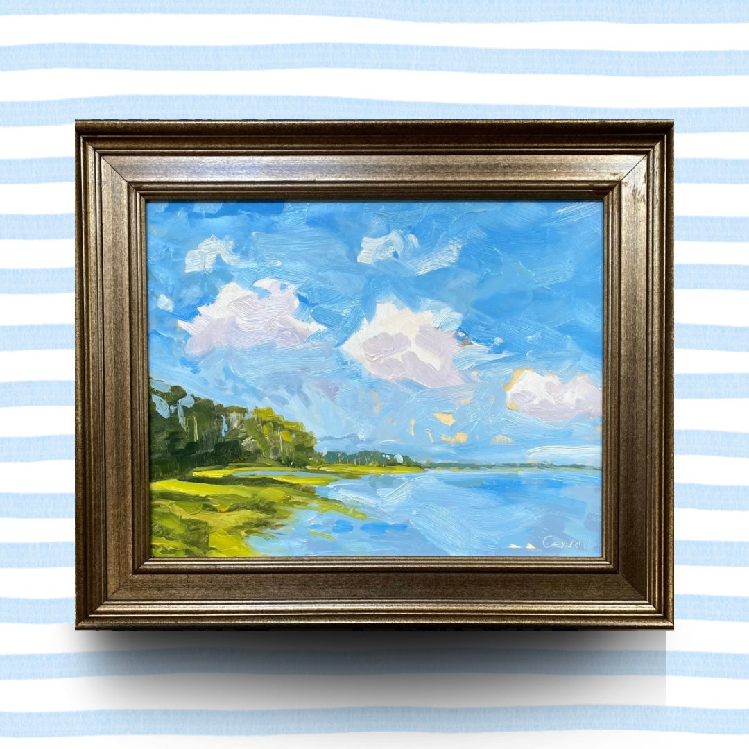 “Charleston Summer Sky” is an original oil painting on birch wood panel, nestled into a deep gold wood frame. Ready to hang.