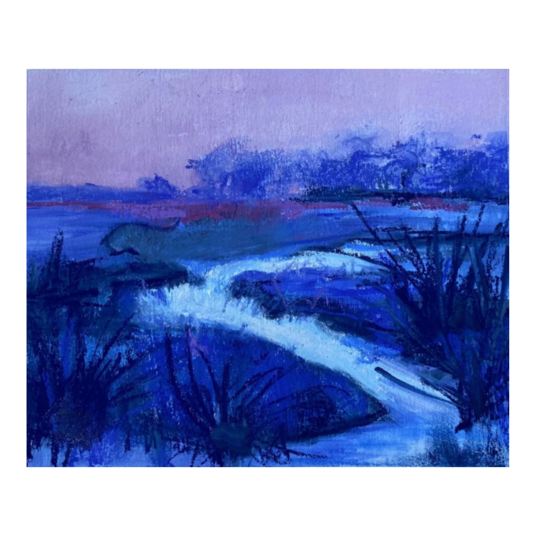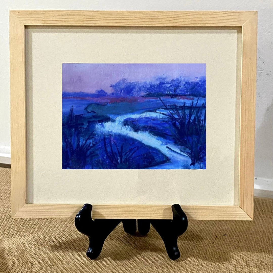 "Dreamy Marsh in Blue," is an original 11.5" x 11.5" pastel rendering on paper reflecting an evening Charleston marsh bathed in calming blue hues near dusk. It adds a pop of color and an elegant touch of peacefulness to any space. Painting is matted & framed.
