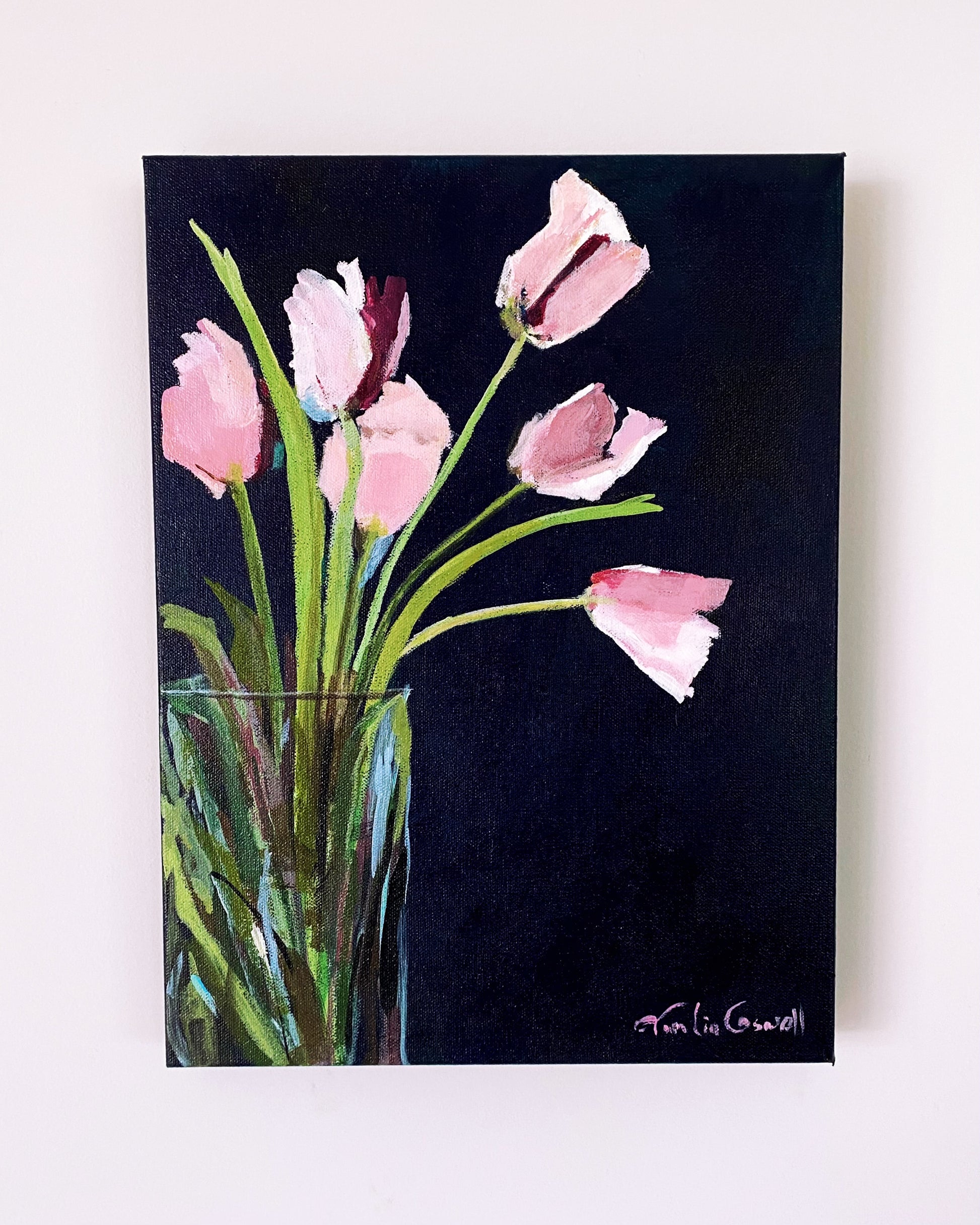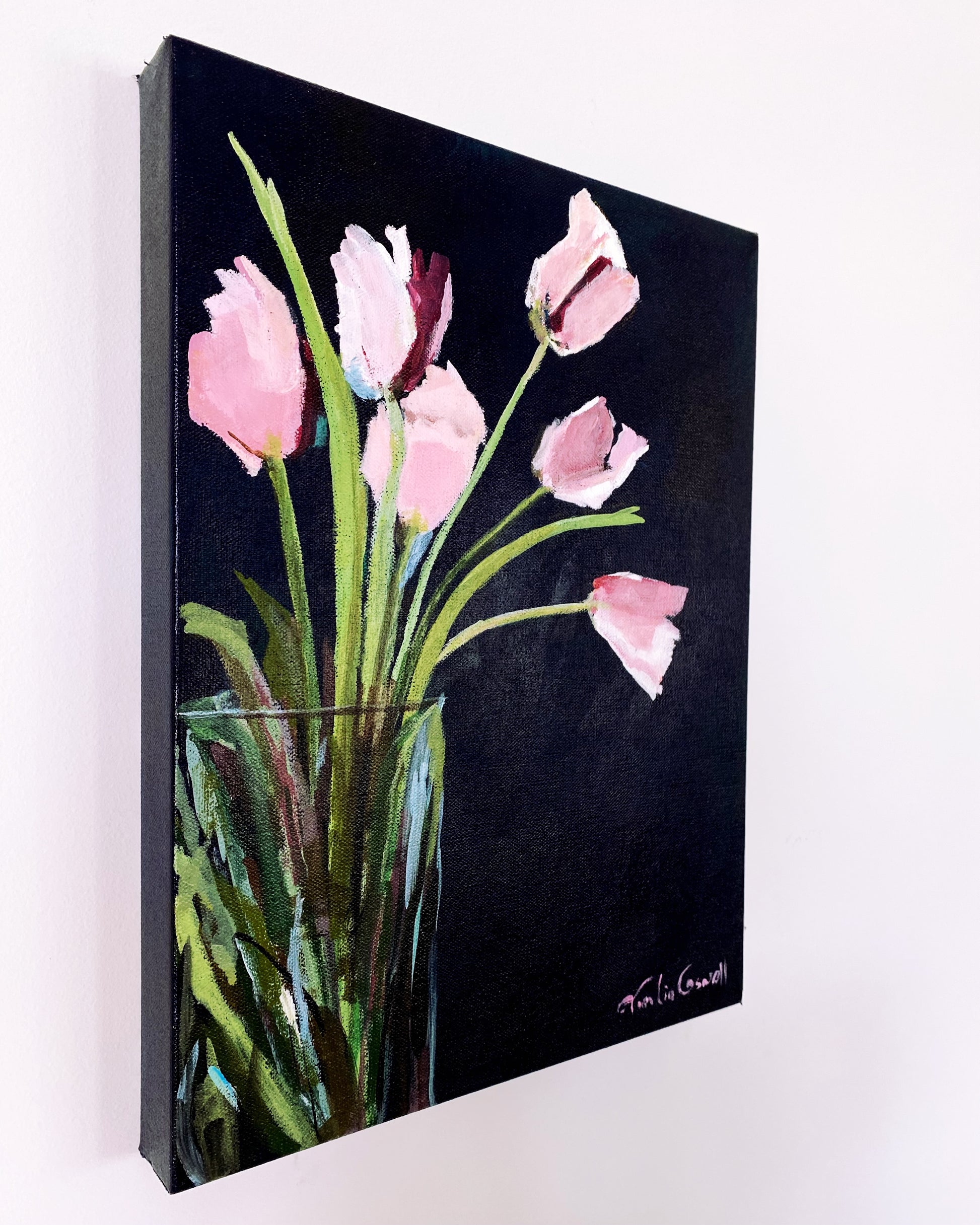 Celebrate the burst of spring with "Early Spring Blooms," a playful floral still life featuring tulips full of life and color. This dramatic painting brings the joyful energy of the garden right into your home. Mixed media on canvas original painting measuring 12" x 16". Sides painted solid to match the front.