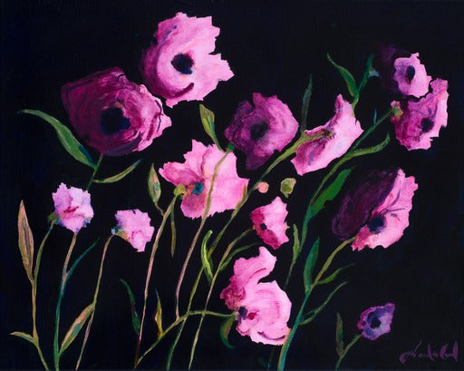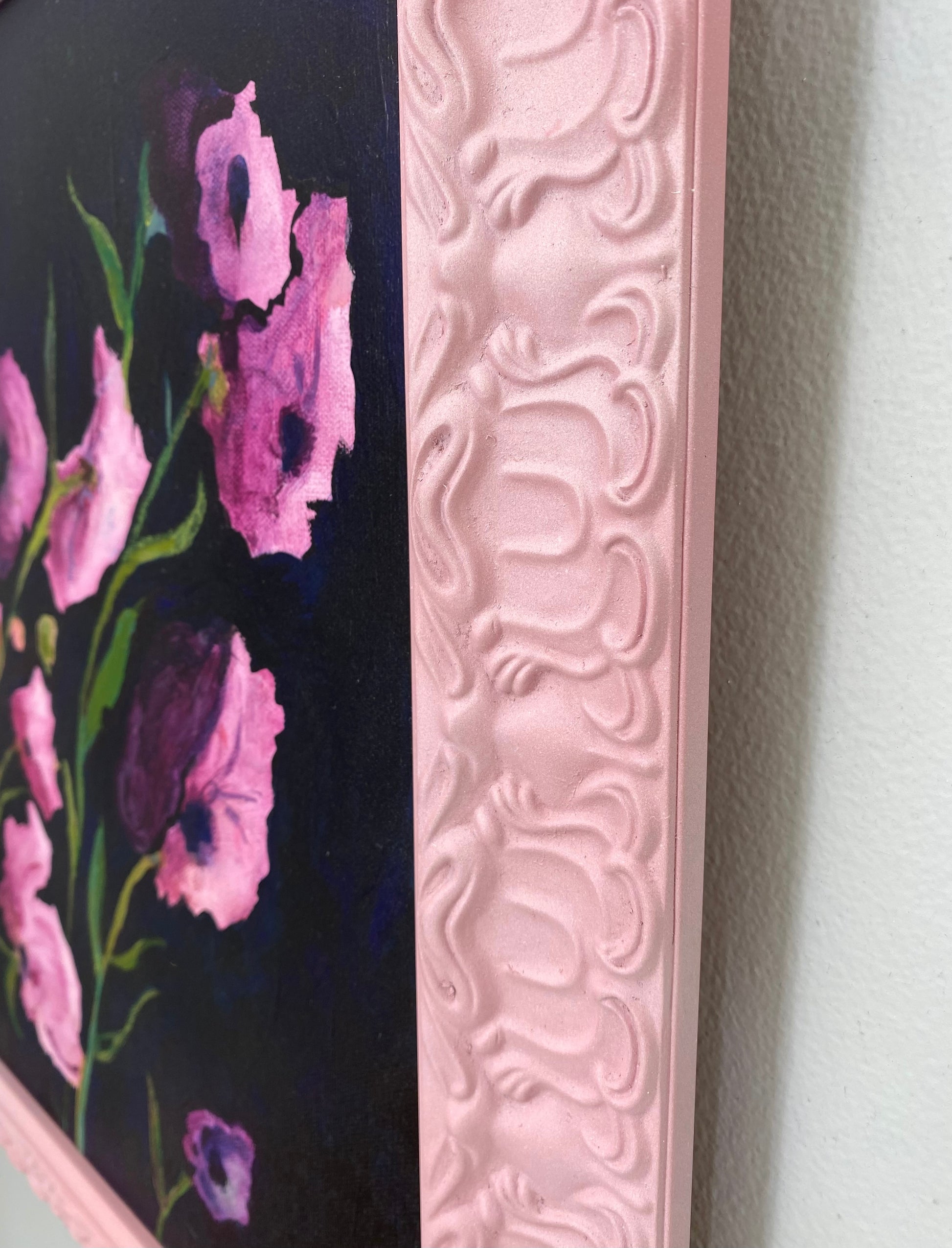 "Fragility of Night" is an original painting on canvas using ink on an acrylic background. Its background colors vary between midnight & sapphire blues and black. Custom made, hand painted wood frame. SOLD FRAMED. Ready to hang.