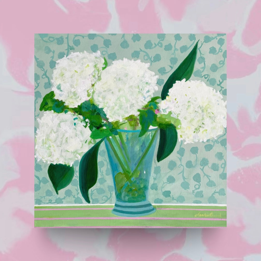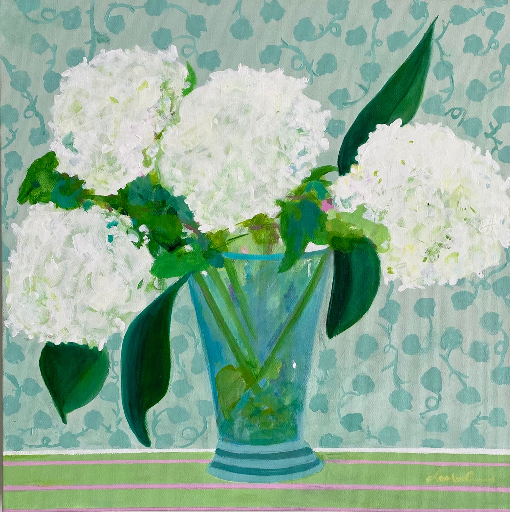 20" x 20" mixed media on gallery wrapped canvas. Sides painted to match solid background color of the front.