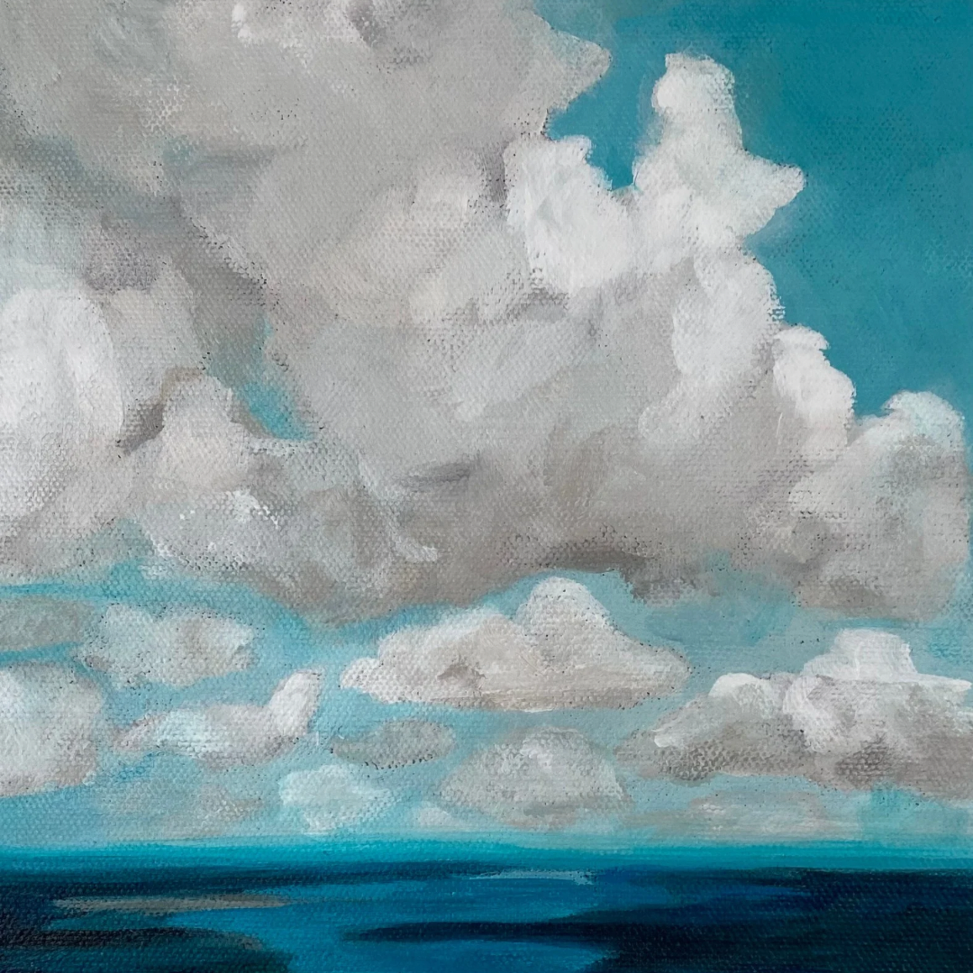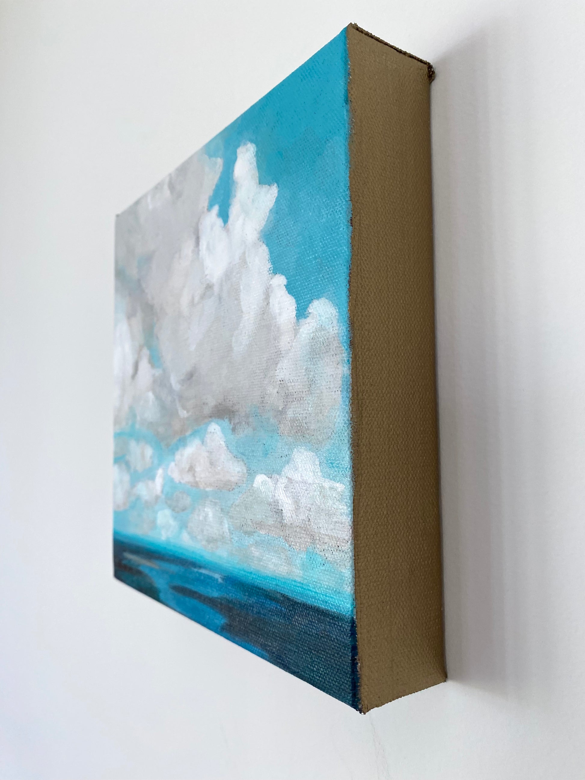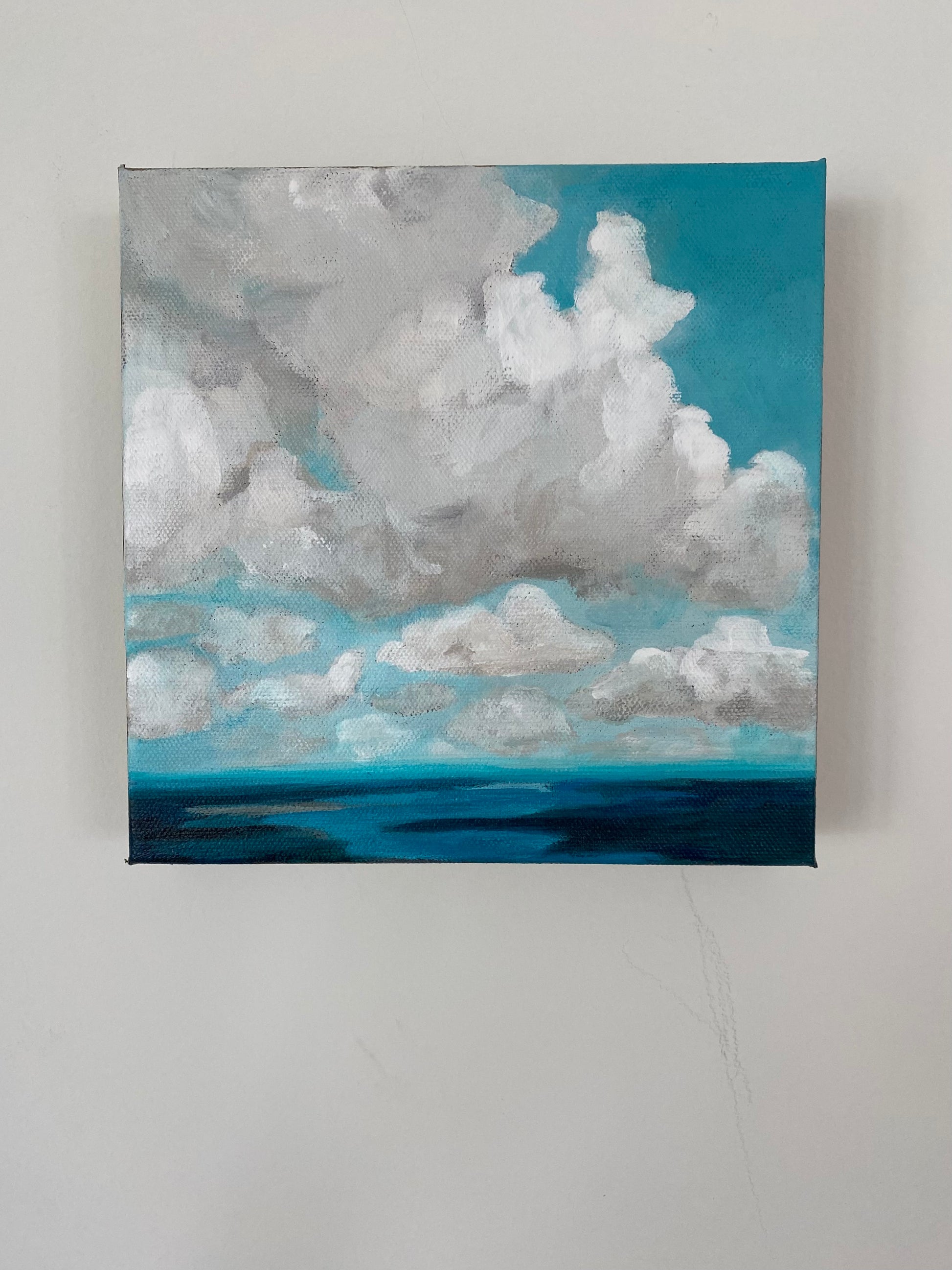 Perfect Day captures a serene blue landscape where big, fluffy clouds float gracefully across the sky over the sea. This original painting evokes a sense of calm and timeless beauty, making it an elegant addition to any space. Its rich, yet subtle hues and thoughtful composition invite quiet reflection and appreciation of nature's peaceful moments. Perfect Day is an original 8x8 mixed media painting on gallery wrapped canvas. Sides painted rich metallic gold.