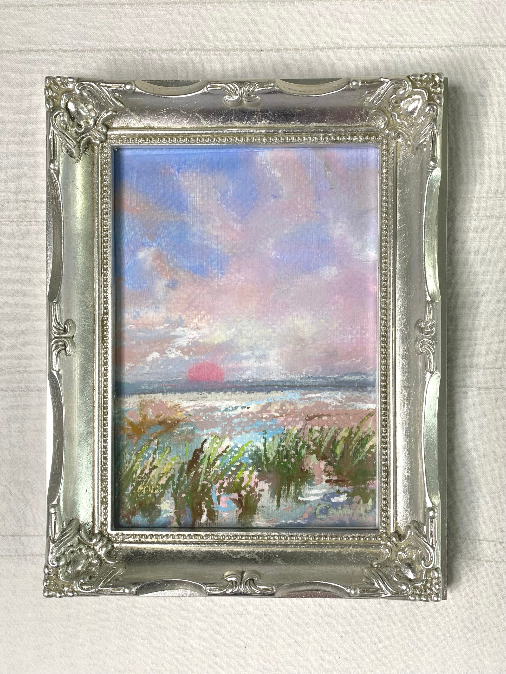 “Rosie Morning” is an original 4” x 6” pastel on paper. I placed it under glass in an ornate vintage silver wood frame. It has a black velvet backing, and may be hung or propped with its built-in strut. SOLD FRAMED