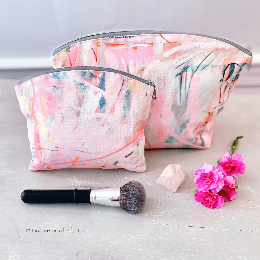 Deep gray interior. Exterior made of cotton-linen blend material. Machine washable (gentle cycle). May be spot cleaned with a non-chlorine wipe. Sewn-in, magnetic closure toothbrush pocket. Toiletry bag has exterior zipper pocket. Locally made with Love in Charleston.