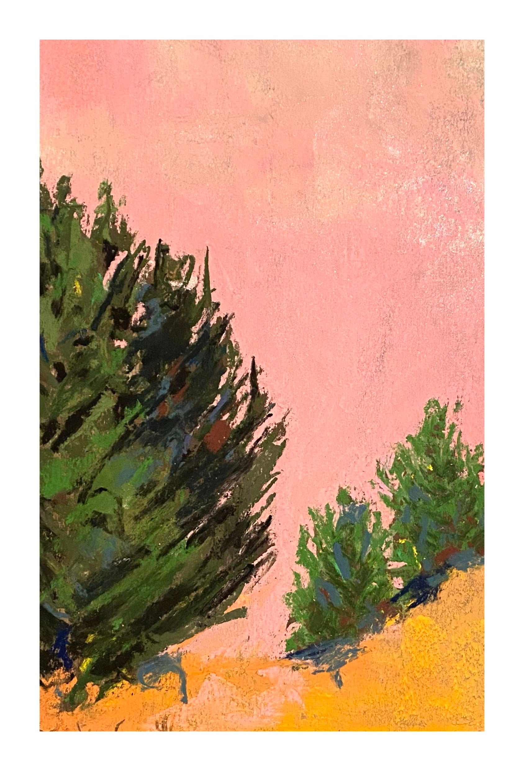 "Summit Sunset," is a vibrant 12" x 16" pastel artwork on paper capturing the beautiful glow of a sunset behind summit trees. This piece reflects warmth and happiness inviting you to pause and appreciate nature’s peaceful moments. Perfect for adding a touch of color to your space.